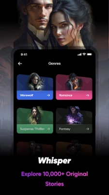 Whisper'da, Alpha&Luna, Vampirler, Cadılar, Milyarderler, Mafya, Kral&Kraliçe, Erkekler&Utangaç Kız veya Reddedilme, Sözleşmeli Evlilik, İlk Aşk, İntikam, İhanet, Büyü Dünyası, Zorbalık Aşk gibi konuları seviyor olun, memnun olacağınız birini bulacaksınız.