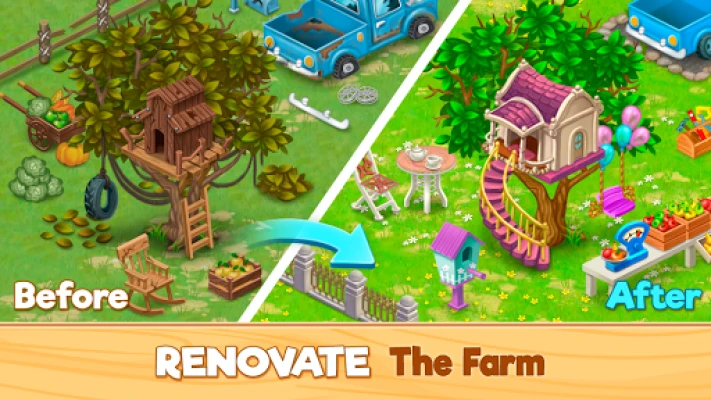 Bu uygulama, çiftlikteki alanları dekore etmek ve restore etmek için renkli eşleştirme-3 seviyelerini oynayabileceğiniz bir oyundur. Yeni bir ev tasarlayın, egzotik ve harika mobilyalar seçin. Çiftlik hikayesinin yeni alanlarını açın ve oyundaki tüm karakterlerle arkadaş olun!
