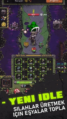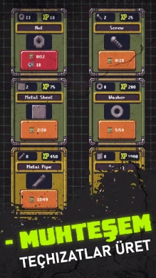 Teçhizat üretmek de bu oyunun önemli bir özelliği. Hayatta kalmak için hurda çıkarıp zırh yapabilir, yeni idle silahlar üretmek için eşyalar toplayabilir ve epik hayatta kalma ganimetleri için bileşenler üretebilirsiniz. Böylece hayatta kalma şansınızı arttırabilirsiniz.