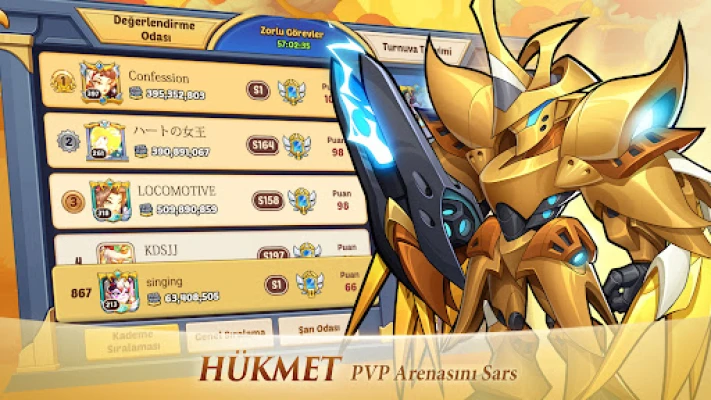Arenaya girerek dünya üzerinde farklı ülkelerden oyuncularla PK yapabilir ve sıralama tablosunda en yüksek onura ulaşarak en güçlü savaş eşyalarını kazanabilirsiniz. Oyunun video reklamlarından dolayı WRITE_EXTERNAL_STORAGE ve READ_EXTERNAL_STORAGE izinlerine ihtiyaç duyulur.