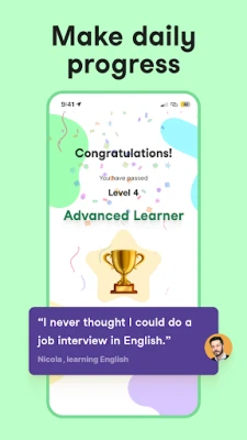 Size Hissedebileceğiniz Sonuçlar 🌍 Her yerde bağlanın: Sosyal ve profesyonel ortamlarda rahat hissedin. 📈 Mesafeleri kırın: Sıkışmış hissettiğinizde ilerleme sağlayan konuşmalar. 🏆 Başarıya hazırlanın: TOEFL, DELE, DELF, mülakatlar ve daha fazlası için özel egzersizlerle pratik yapın.