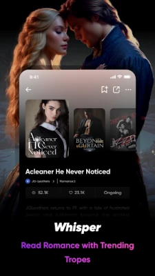 Whisper'da, Alpha&Luna, Vampirler, Cadılar, Milyarderler, Mafya, Kral&Kraliçe, Erkekler&Utangaç Kız veya Reddedilme, Sözleşmeli Evlilik, İlk Aşk, İntikam, İhanet, Büyü Dünyası, Zorbalık Aşk gibi konuları seviyor olun, memnun olacağınız birini bulacaksınız.